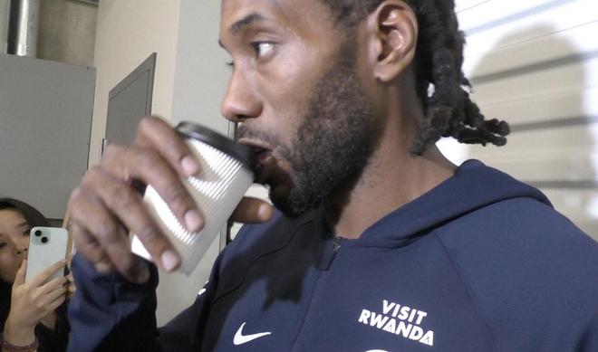 赛后,快船球员伦纳德在接受采访时喝起了饮料,记者问到:“你在喝什么?”